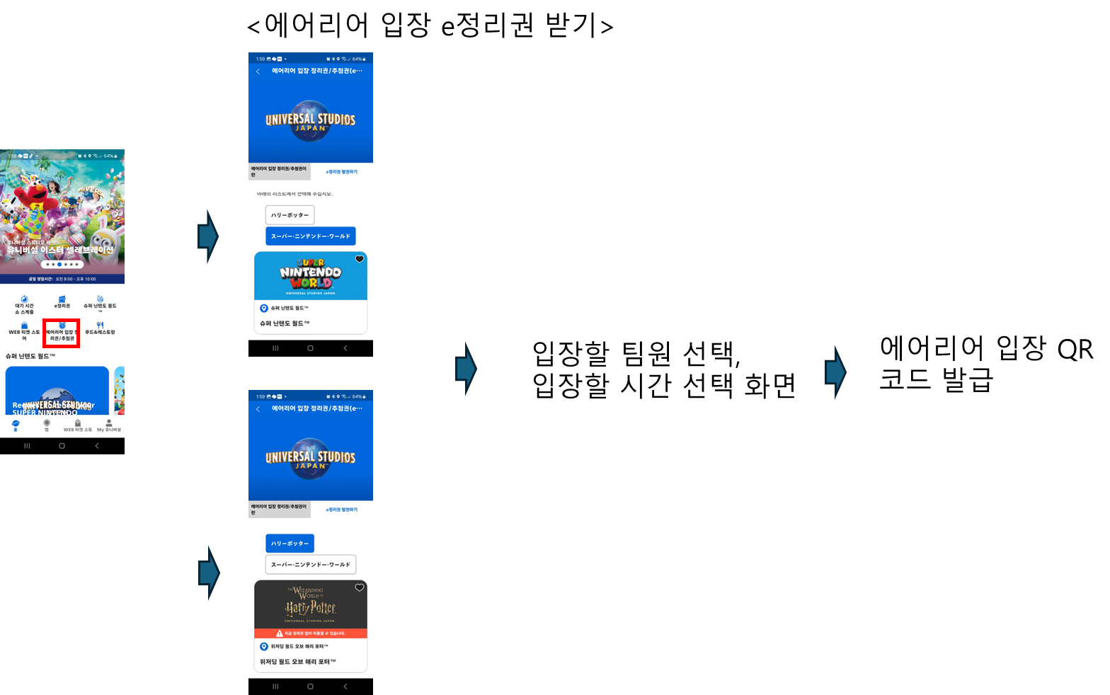 즉, 각각의 팀원의 QR코드로 빨리 입장하고 한 명의 팀원이 USJ 앱에서 모두 다 입장하면 빨리 e정리권을 신청하면 슈퍼 닌텐도 월드, 위저딩 월드 오브 해리 포터 입장권을 받을 수 있습니다.